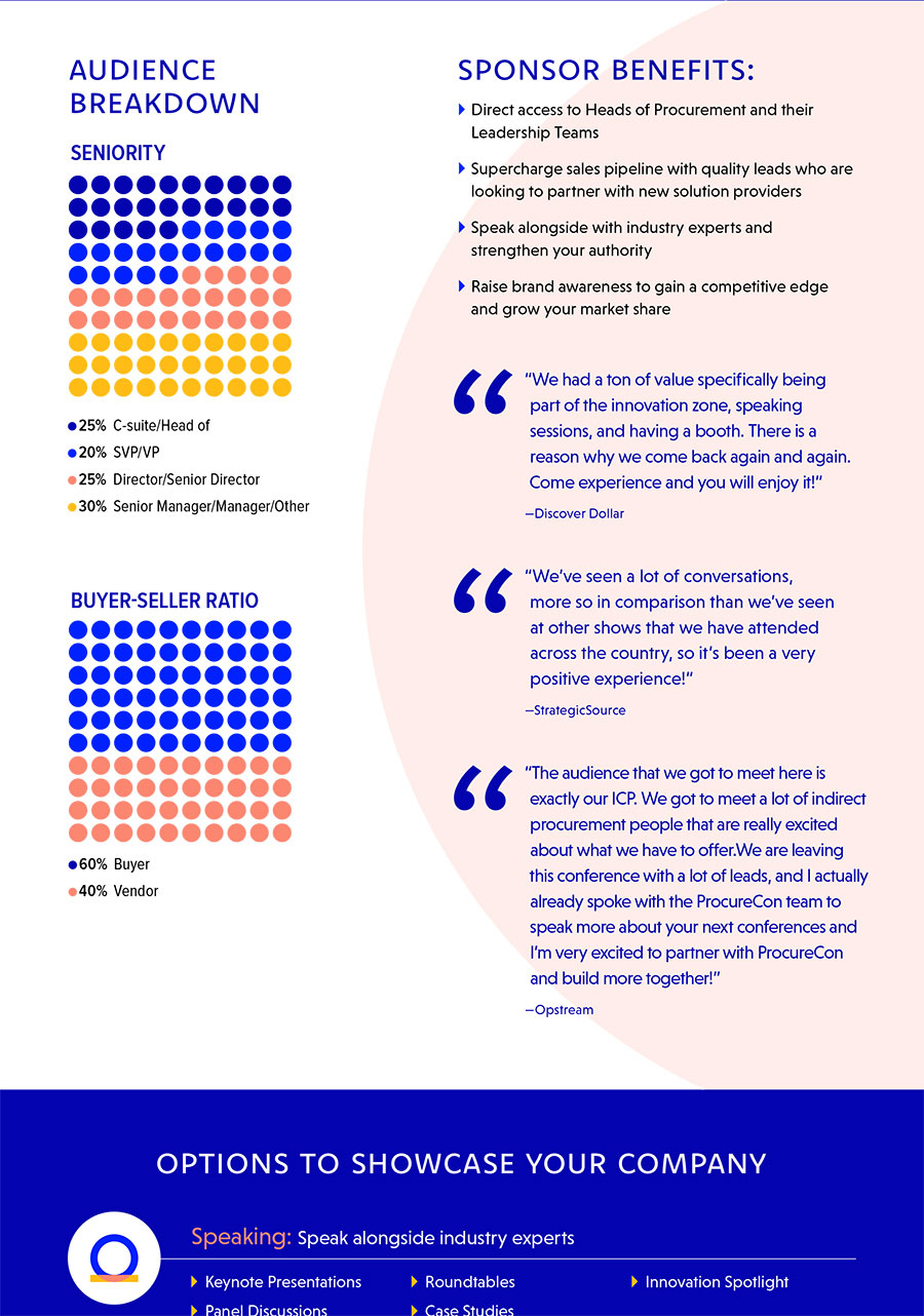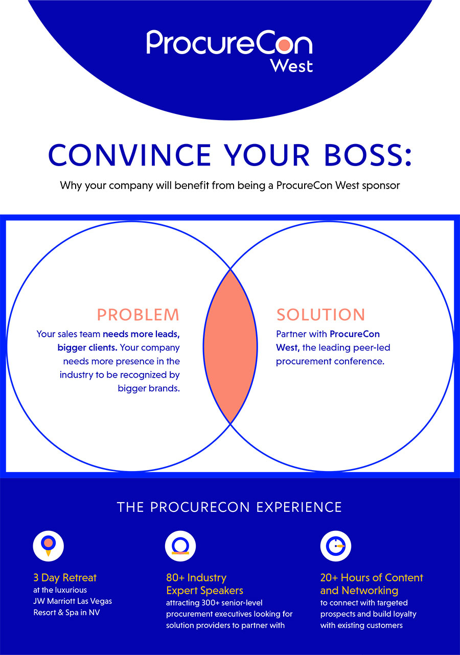 Gain direct access to 300+ procurement professionals, including the industry’s most powerful decision-makers. ProcureCon is the ultimate place to amplify your brand.